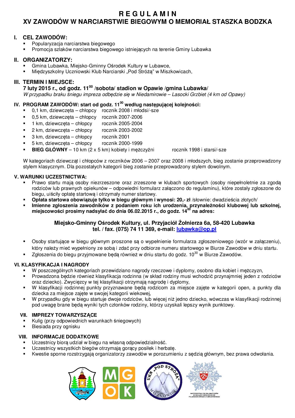 Już w sobotę dnia 7 lutego 2015 roku, zapraszamy wszystkich miłośników biegów narciarskich na rezerwowe trasy narciarstwa biegowego do Niedamirowa, gdzie rozegrane zostaną XV Zawody w Narciarstwie Biegowym o Memoriał Staszka Bodzka.